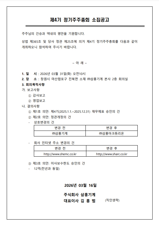 [공고]제4기 정기주주총회 소집 통지